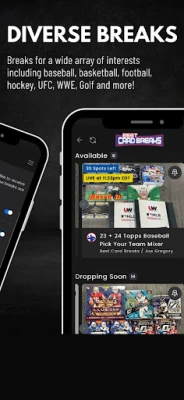 The Best Card Breaks app is a marketplace for sports cards and trading cards designed with collectors in mind. We offer sports card group breaks that allow you to collect the teams and players you want. New custom notifications can be tailored to your favorite sports and products so you don’t miss a beat!